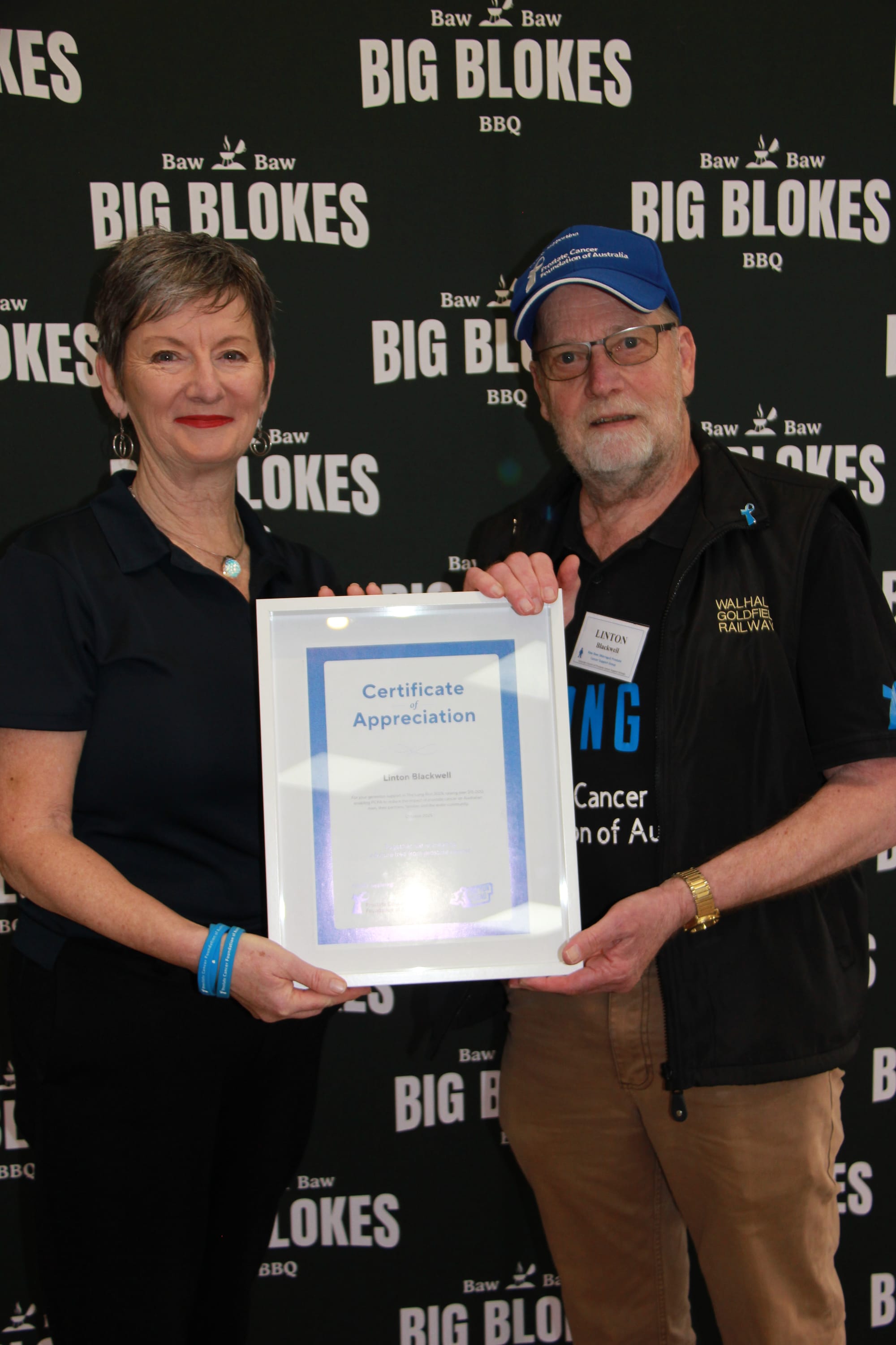 At Friday's Big Blokes BBQ, Linton was presented with a cheque and a certificate of appreciation from the Prostate Cancer Foundation of Australia.